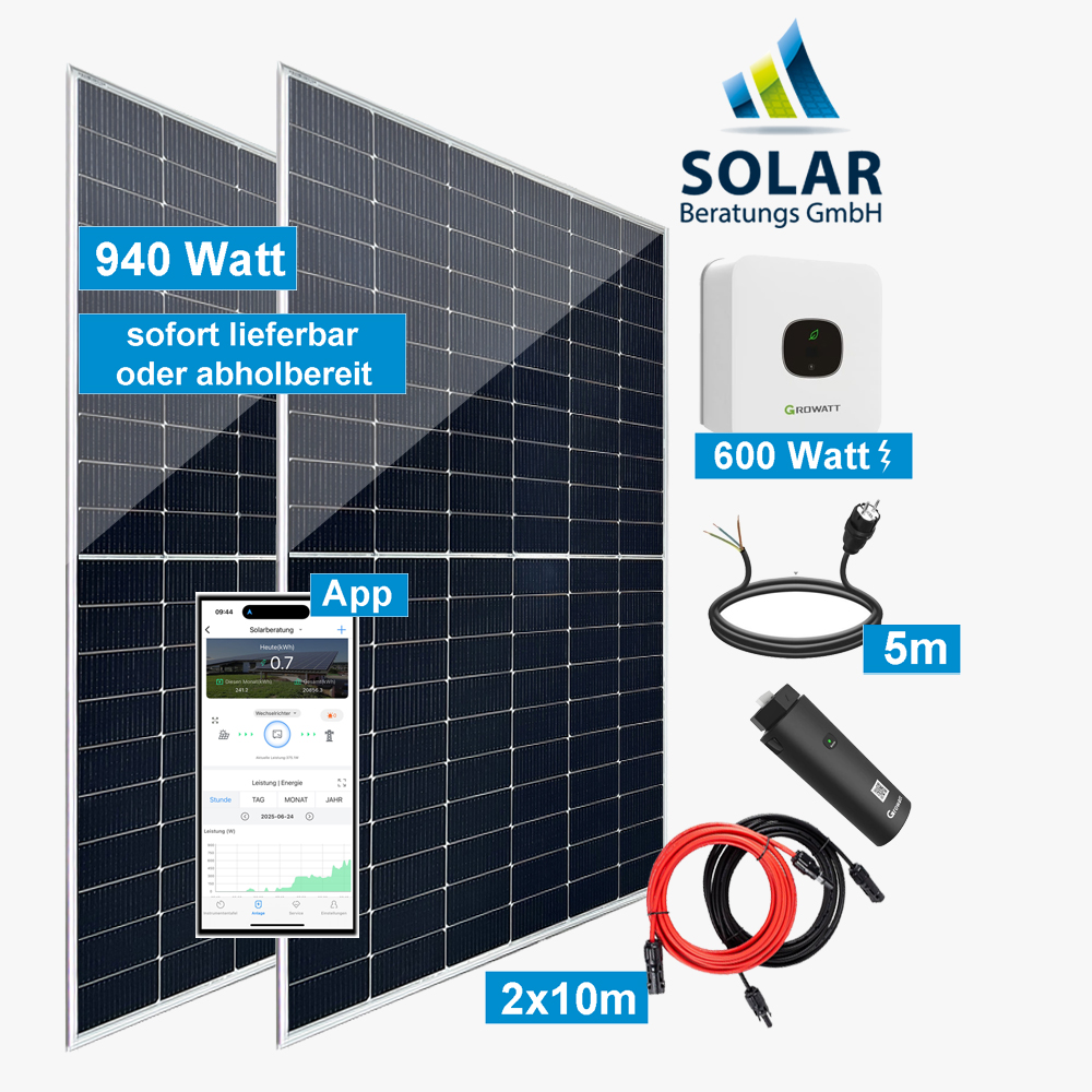 Komplettset: Balkonkraftwerk 940 Watt mit Growatt Wechselrichter MIC 600TL-X und Solarmodul Jinko 470 Watt