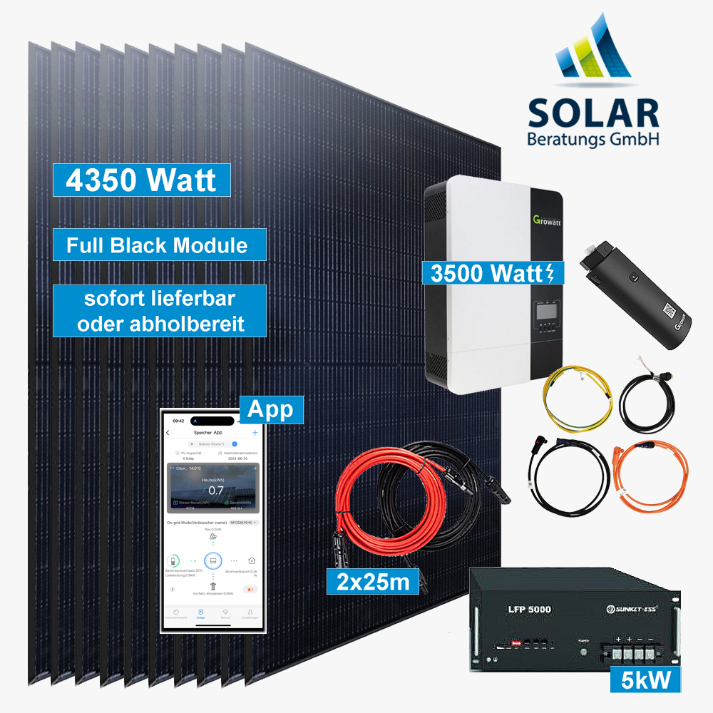 Komplettset: Insel-Anlage 4.350 Watt mit Growatt Wechselrichter SPF 3500ES mit 5kW Speicher und Solarmodul Jinko 435 Watt